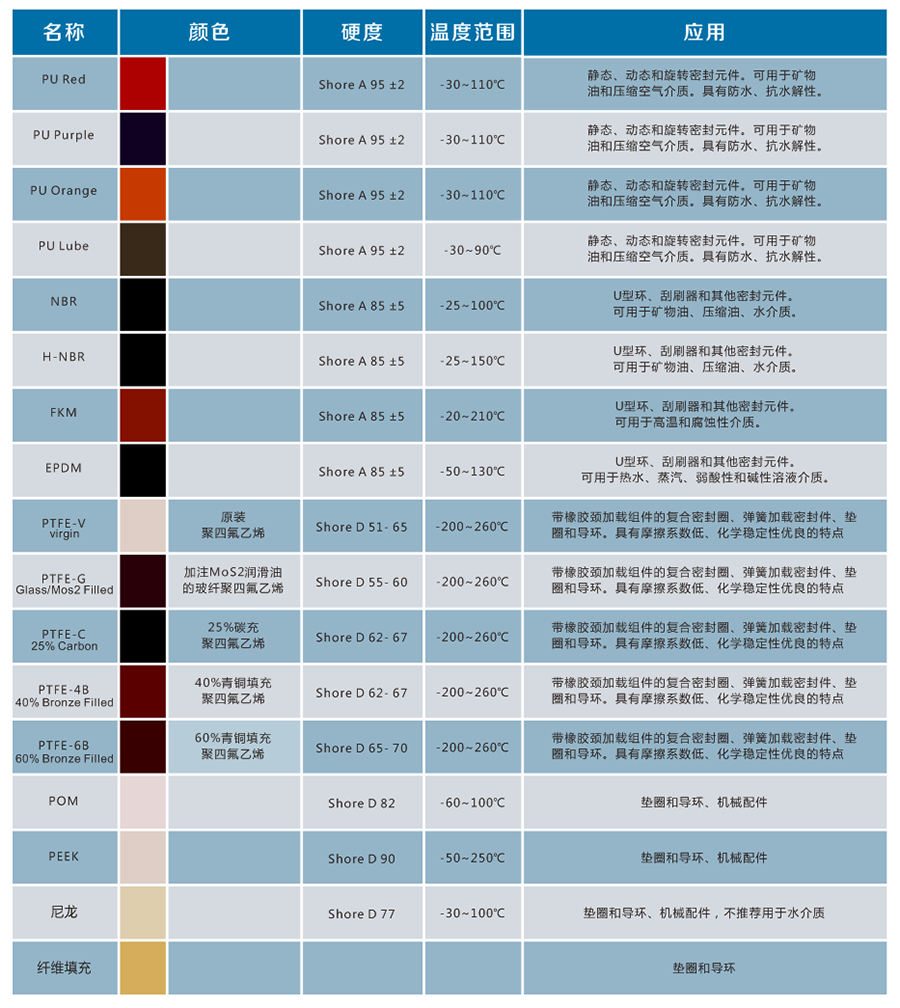 密封件可采用以下材料生产:聚氨酯、丁腈橡胶、氟橡胶、氢化丁腈胶、热塑性材料、PTFE、聚脂甲醛、尼龙等等...